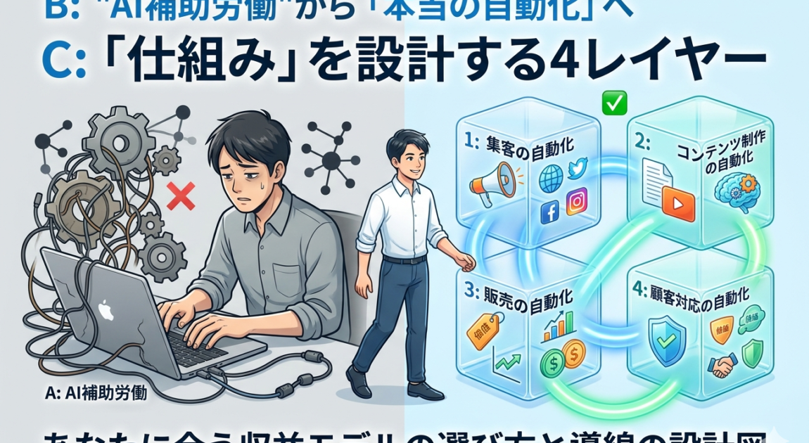 💡 AI収益化の全体構造をまだ理解していない方は、まず先にこちらをお読みください。本記事は「自動化という手段の設計に特化した実践編」です。収益モデルの全体像を先に把握した上で読むと、理解の速度が上がります。